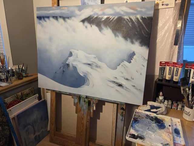 This large acrylic measures 3' x 4' bringing you right to the heart of winter. Being above the sea of clouds while traversing a ridge. looking for the perfect entry for an amazing run.