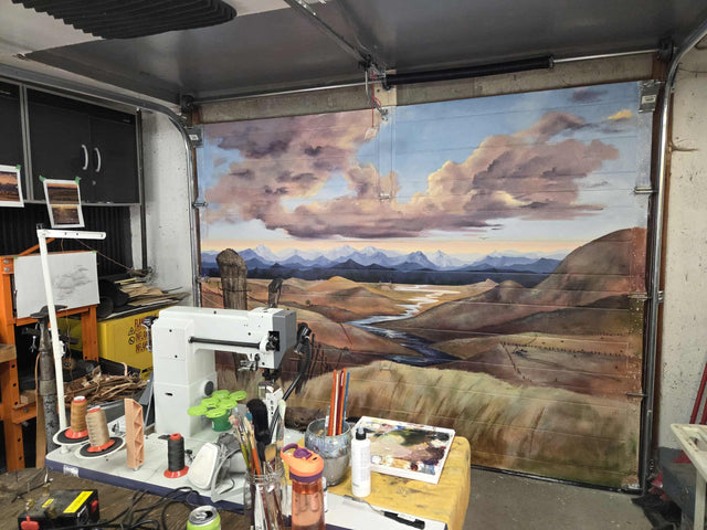 Here we have Bob's inside garage door mural in his ultimate Boot workshop here in Nelson. A western inspired vastness that turned his small space into an expansive view. Not to mention a great back drop for photos for online marketing for his business.