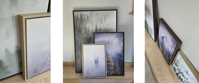 New in the shop, beautiful framed canvas. Elevating the artwork and your space. These are framed with the canvas hovering inside of the wooden frame. Absolutely gorgeous in pale wood color, brown stain and black.