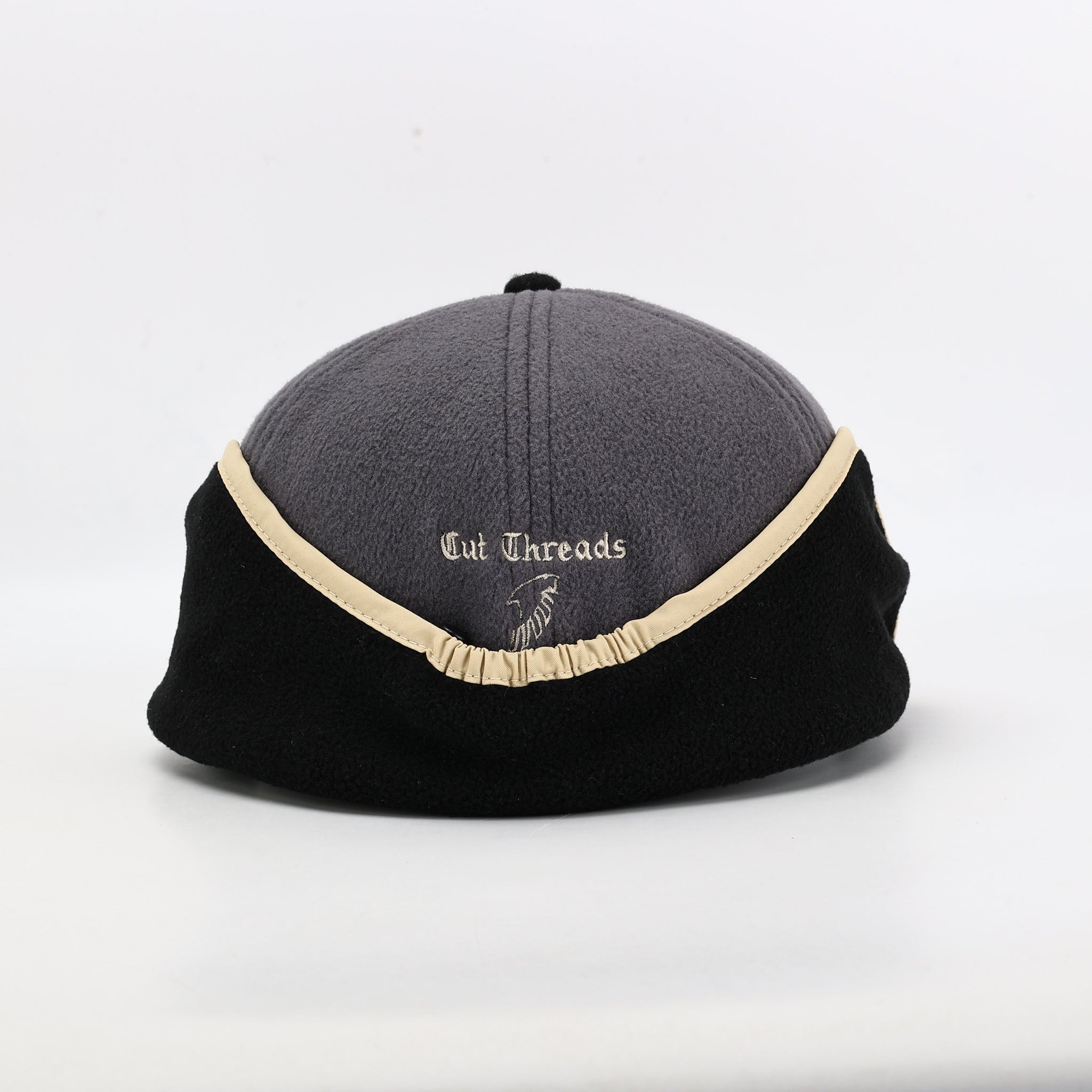 Fleece top and sides with a polyester brim, adjustable for sinching in the snowstorm. The great thing about these caps is the sinched detail on the back of the earflap so it sits nice when its up or down.