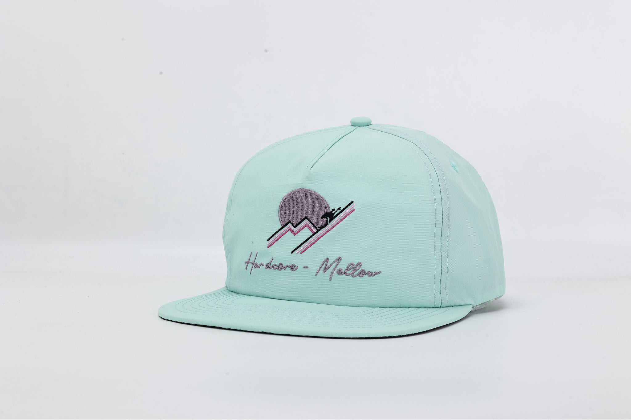 A minty fresh nylon cap, with purple embroidery, purple taping, dark under-brim. A color explosion that's not overwhelming but still bright. This nylon is great for active types, who need a water resistant cap for adventures. Take the skiing penguin with you everyday!