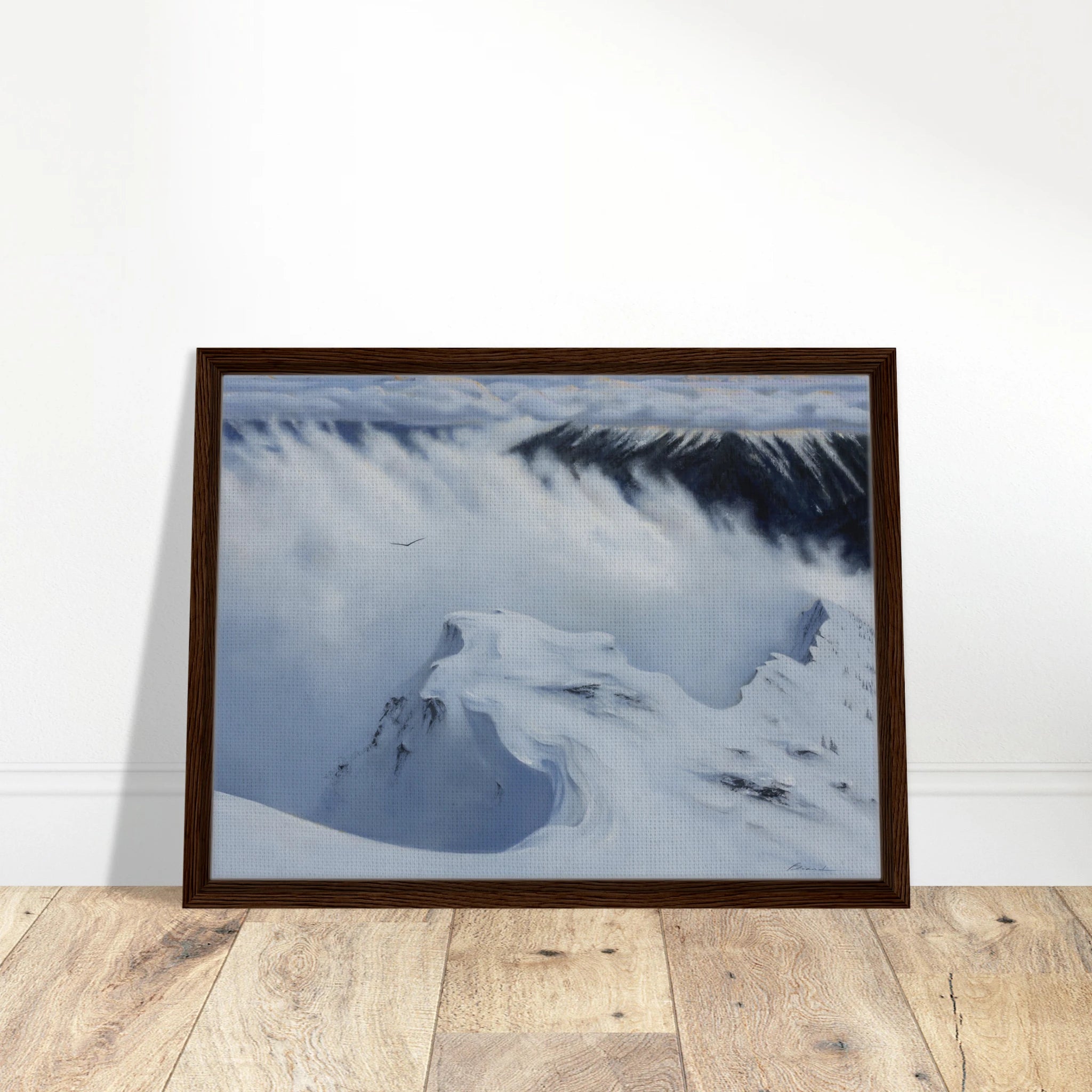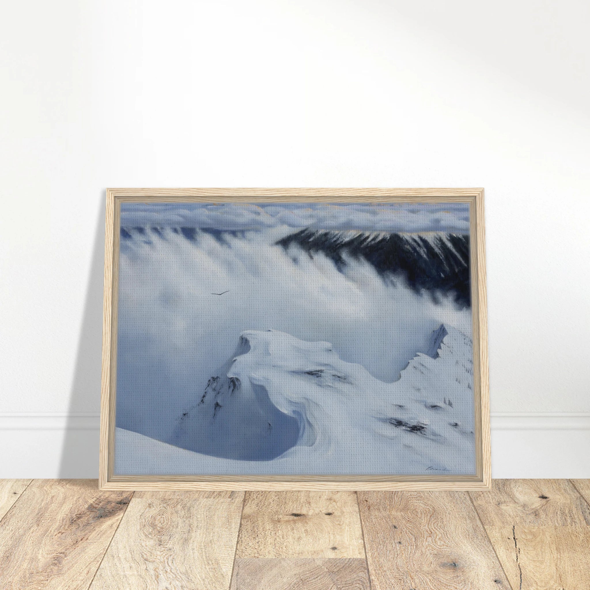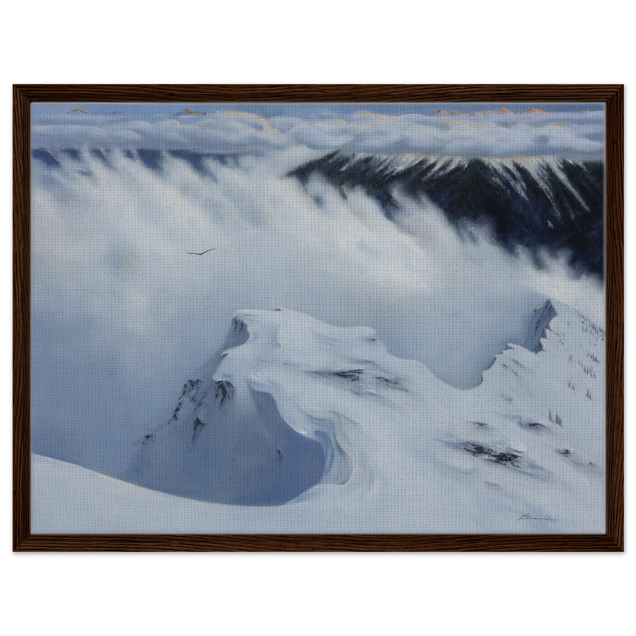 I worked on this in November 2025, acrylic. It was a challenge for me to work with the wind scoured snow and getting the colors faded correctly. At the last minute I decided to add some alpine glow to the tips of the peaks as well as a gold brushing on the clouds and mist. It made it sing.