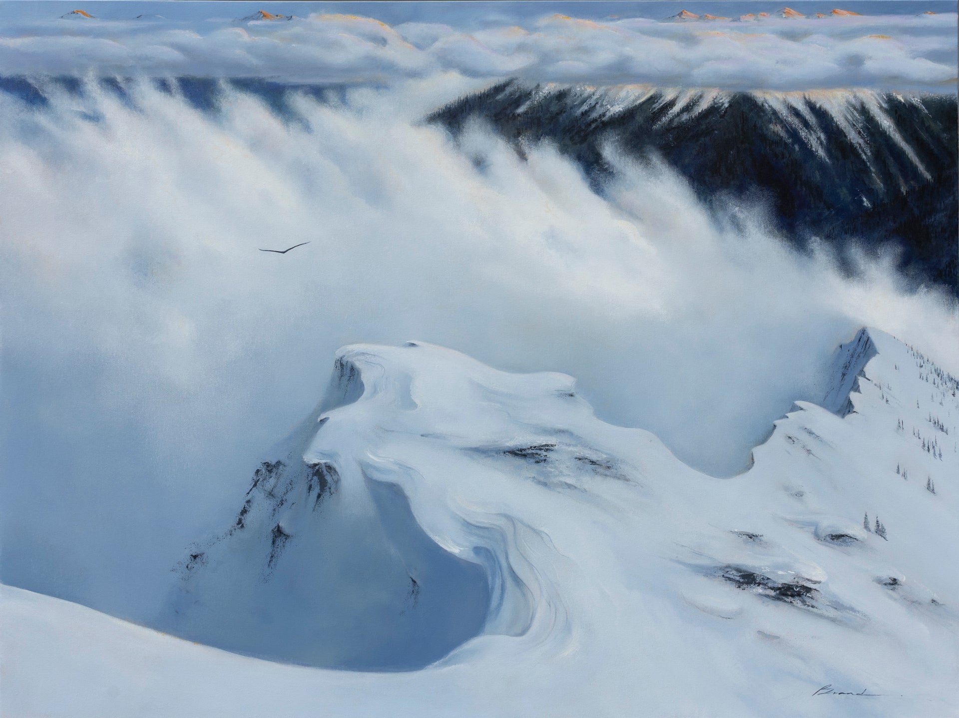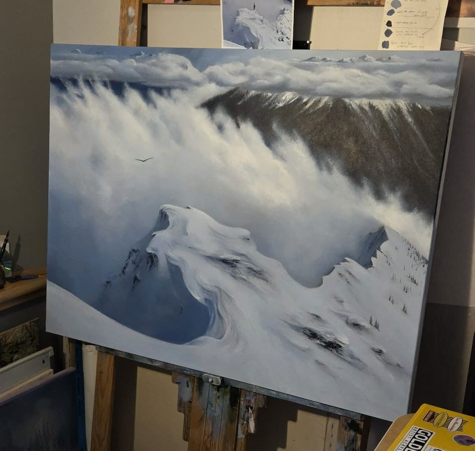 I worked on this in November 2025, acrylic and measuring 3 x 4 feet. I am very excited to offer this as a 1st in a series headed into the depths of winter in the alpine that I love so much. It was a challenge for me to work with the wind scoured snow and getting the colors faded correctly. At the last minute I decided to add some alpine glow to the tips of the peaks as well as a gold brushing on the clouds and mist. It made it sing. The original work glows. The highlighted white on the mist looks like its lifting off the canvas, the gold in the clouds will reflect in the light in real life. And the sub alpine trees are dark and full of texture.